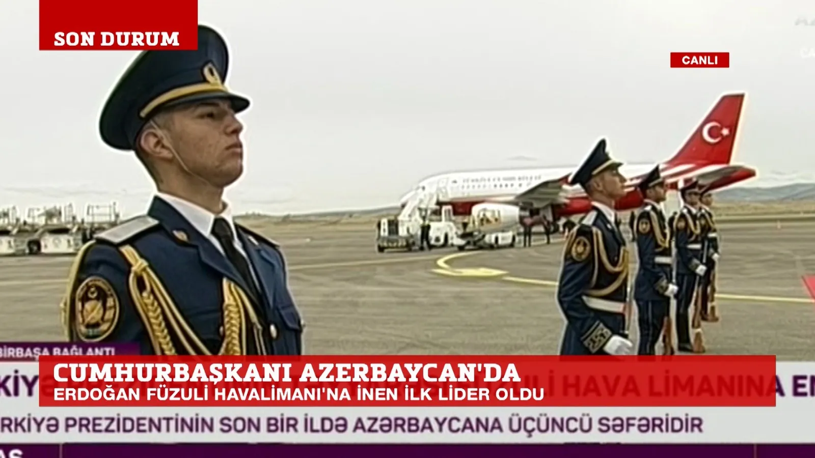 Cumhurbaşkanı Erdoğan, Azerbaycan Cumhurbaşkanı İlham Aliyev’in daveti üzerine sabah saatlerinde, Ankara Esenboğa Havalimanı’ndan Azerbaycan’a hareket etti. Cumhurbaşkanı Erdoğan’a ziyaretinde; Dışişleri Bakanı Mevlüt Çavuşoğlu, Ulaştırma ve Altyapı Bakanı Adil Karaismailoğlu, Milli Savunma Bakanı Hulusi Akar, Çevre ve Şehircilik Bakanı Murat Kurum ile İletişim Başkanı Fahrettin Altun ve Cumhurbaşkanlığı Sözcüsü İbrahim Kalın eşlik etti.