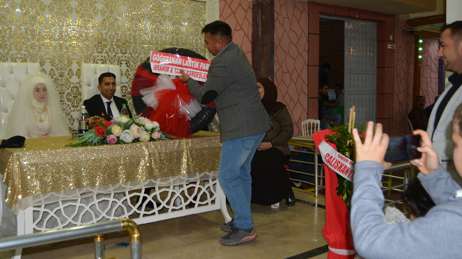 Düğüne katılan davetlilerden Yasin ve İbrahim Göğebakan, servis şoförü Nihat Alyukarı’ya hediye olarak süsledikleri minibüs lastiğini hediye etti.