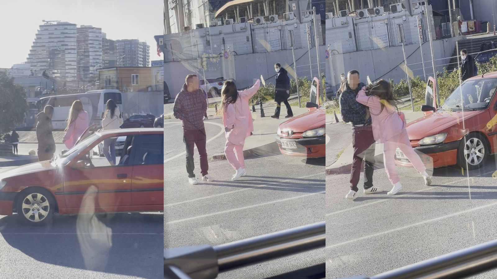 Kameraya yansıyan görüntülerde araç içerisinde tartışmaya başlayan çiftin araçtan çıkarak kavga etmeye başlaması ve genç kadının telefonu yere fırlatıp ardından erkek arkadaşına saldırması yer alıyor.