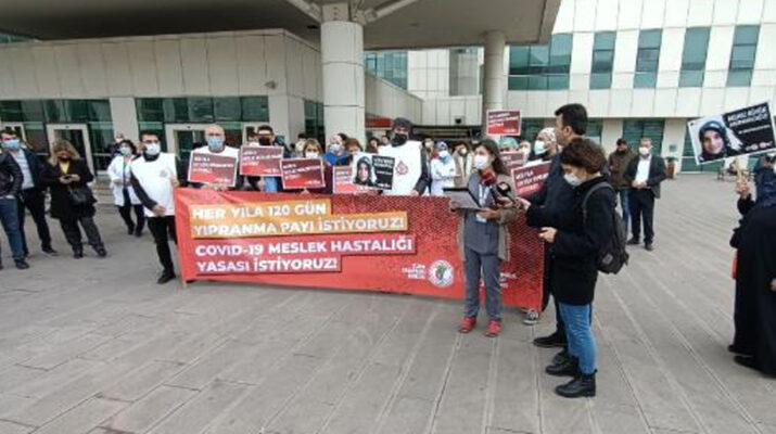 Grup adına konuşan Kadın Doğum Asistan Hekimi Dr. Handan Turhan Karakuş, “Hekimler birçok ülkede Kovid-19 meslek hastalığı sayılırken bizim ülkemizde hala daha yasal düzenlemesi yapılmadığı için göç ediyor. Kısacası emeğimiz görmezden gelindiği için hekimler bu topraklarda hekimlik yapmak istemiyoruz diyorlar. Bu gidişata dur demek için haklarımızı bir an önce istiyoruz. Kovid-19 için meslek hastalığı yasası çıkarılmasını talep ediyoruz” dedi.