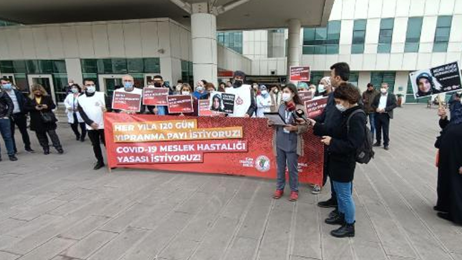 Türk Tabipler Birliği ile İstanbul tabipler Odası üyesi bir grup, saat 12.30’da Sultangazi Haseki Eğitim ve Araştırma Hastanesi önünde eylem yaptı. Toplanan grup, Kovid- 19’tan ölen meslektaşları ve geçtiğimiz günlerde Ankara’da geçirdiği trafik kazasında hayatını kaybeden asistan hekim Dr. Rümeysa Berin Şen için saygı duruşunda bulundu. Grup daha sonra ‘Kovid-19 Meslek Hastalığı Yasası İstiyoruz’ sloganıyla, Kovid-19’un mesleki hastalık sayılması ve asistan hekimlerin çalışma saatlerinin düzenlenmesi için basın açıklaması yaptı.