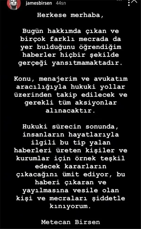 Metecan James Birsen, “Bugün hakkımda çıkan ve bir çok farklı mecrada da yer bulduğunu öğrendiğim haberler le hiçbir şekilde gerçeği yansıtmamaktadır. Konu, menajerim ve avukatım aracılığıyla hukuki yollar üzerinden takip edilecek ve gerekli tüm aksiyonlar alınacaktır. Hukuki sürecin sonunda, insanların hayatlarıyla ilgili bu takip yalan haberler i üreten kişiler ve kurumlar için örnek teşkil edecek kararlar çıkacağı kararlar ümit ediyor, bu haberi çıkaran ve yayılmasına vesile olan kişi ve mecraları şiddetle kınıyorum” ifadelerini kullandı.
