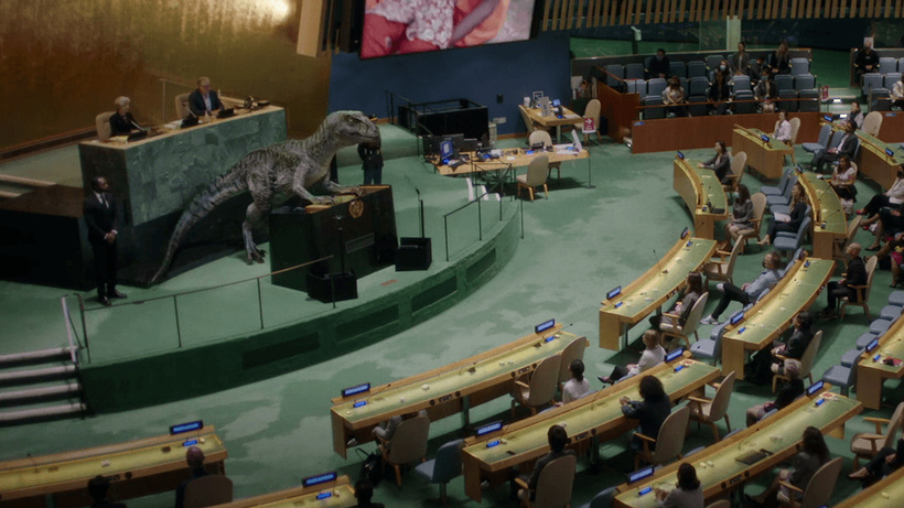 Videoda, New York’taki BM Genel Merkezi’ndeki ünlü Genel Kurul Salonu’na giren ‘Frankie’ isimli dinozor, dinozorların soyunun göktaşlarıyla yok olduğunu ifade ederek insanlığın kendi yok oluşunu fosil yakıtlara milyarlarca dolar harcayarak hazırladığını vurguladı.