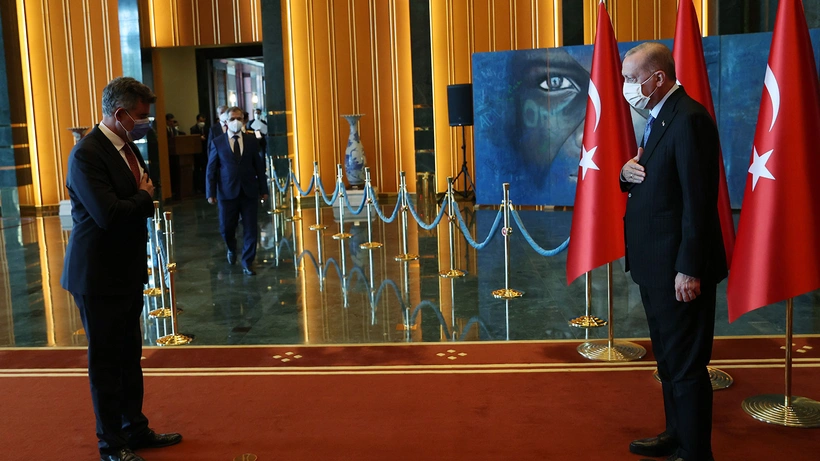 Salgın nedeniyle maske takan katılımcılar, sosyal mesafe kuralına uyarak Cumhurbaşkanı Erdoğan ile uzaktan selamlaştı.