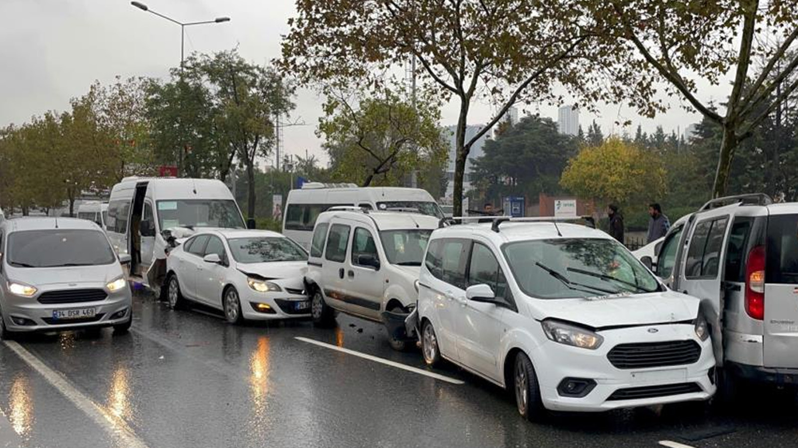 Ancak arkadan gelen 34 EGU 78 plakalı otomobil sürücüsü yağmurun de etkisiyle kayganlaşan yolda duramayarak önde duran araca çarptı. Arkadan gelen biri servis minibüsü 4 araç daha, kazaya karıştı. Toplam 7 aracın birbirine girdiği kazada ölen ya da yaralanan olmadı.