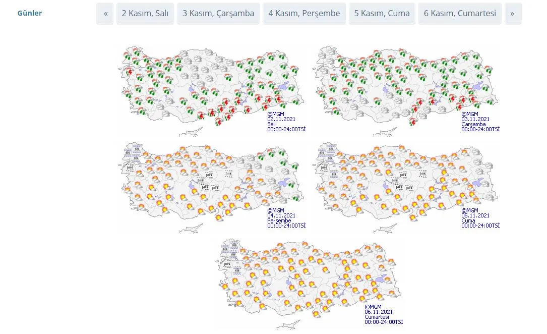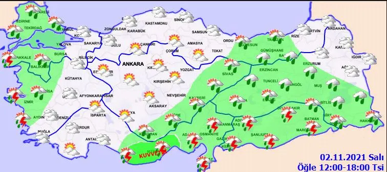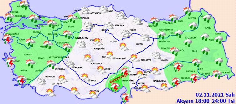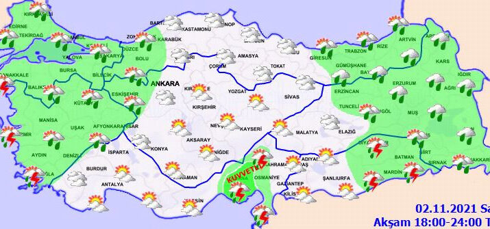 Meteoroloji Genel Müdürlüğü tarafından yapılan son değerlendirmelere göre: Ülkemiz genelinin parçalı ve çok bulutlu, Marmara, Ege, Akdeniz, (Yozgat hariç) İç Anadolu, Batı Karadeniz, Doğu Karadeniz, Doğu ve Güneydoğu Anadolu ile Çorum çevrelerinin yağışlı geçeceği tahmin ediliyor. Genellikle yağmur ve sağanak, Ege ve Akdeniz kıyıları ile Güneydoğu Anadolu’da sağanak ve gök gürültülü sağanak şeklinde görülmesi beklenen yağışların, Mersin ve Adana çevreleri ile Antalya’nın doğu ilçelerinde yerel kuvvetli olması bekleniyor. Sabah saatlerinde Marmara’nın güney ve doğusu, İç Ege ve Batı Karadeniz’in iç kesimlerinde pus, yer yer sis hadisesi bekleniyor.