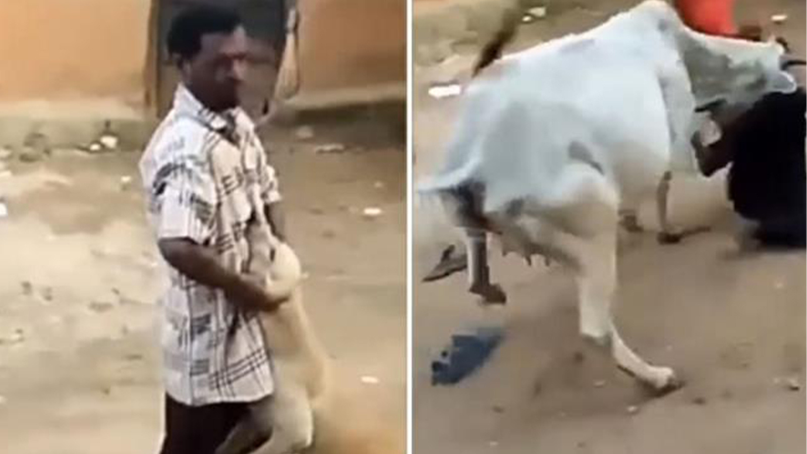 Köpeğin haykırışlarına daha fazla dayanamayan inek, bir anda adamın üstüne saldırarak köpeği kurtardı. İnekten bu hamleyi beklemeyen adamın bir süre kendine gelemediği görüldü.