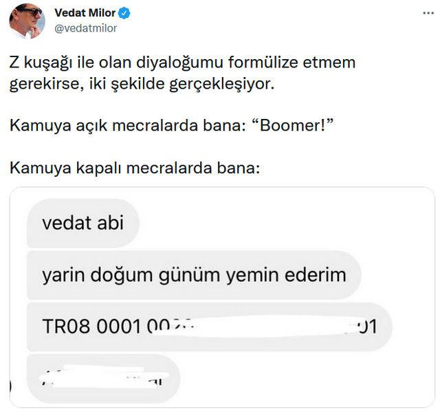 Milor’un paylaşımı çok sayıda yorum ve beğeni aldı. Takipçileri, “Sizin kuşaklar üstü olduğunuza kanaat getirdim”, “Vedat bey siz asla boomer değilsiniz…” yorumları yaptı.