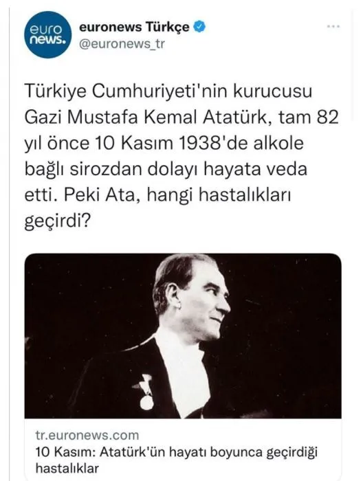 Fransa merkezli Euronews Türkçe, Türkiye Cumhuriyeti’nin kurucusu Ulu Önder Mustafa Kemal Atatürk‘ün ölüm yıldönümünde geçirdiği hastalıklar üzerine bir haber yayımladı.