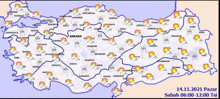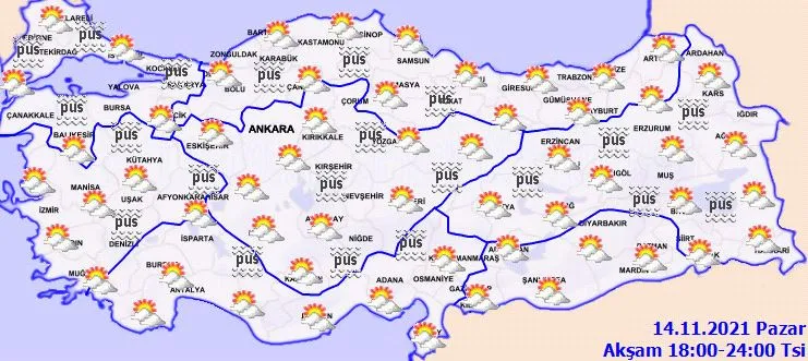 Meteoroloji’den yapılan uyarıda “Ülkemizin kuzey ve iç kesimlerinde yer yer yoğun olmak üzere pus ve sis hadisesi beklendiğinden meydana gelebilecek olumsuzluklara karşı (ulaşımda aksamalar, vb) ilgililerin ve vatandaşların dikkatli ve tedbirli olmaları gerekmektedir.” denildi.