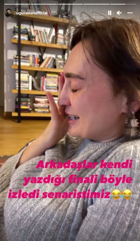 Instagram hesabının hikayeler bölümünde paylaşım yapan Aslan, Sema Ergenakon’un gözyaşlarını tutamadığı kareye “Arkadaşlar, kendi yazdığı finali böyle izledi senaristimiz” yorumunu ekledi.