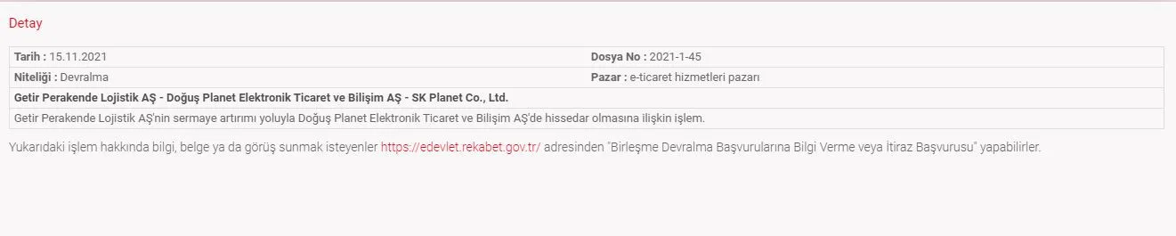 Rekabet Kurumu sitesinde yer alan bilgiye göre Getir Perakende Lojistik AŞ, sermaye artırımı yoluyla Doğuş Planet Elektronik Ticaret ve Bilişim AŞ’de (n11.com) hissedar olmak üzere Rekabet Kurumu’na başvurdu.