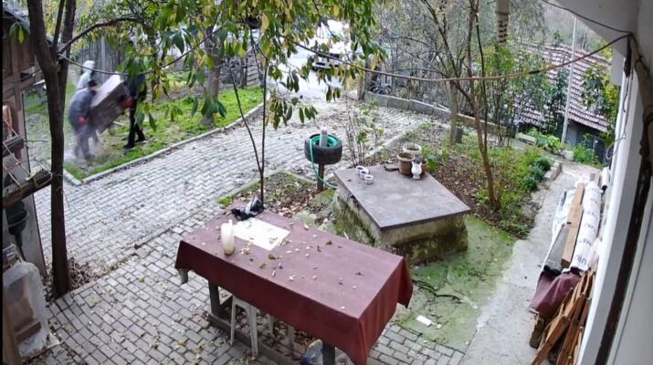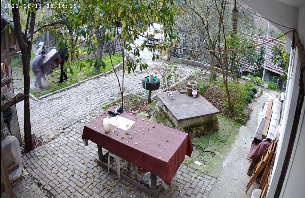 Evde sahiplerinden Burak Saka, “Benim evden çıkışımdan birkaç dakika sonra hırsızlar geliyor, bahçeye giriyorlar. Etrafı kolaçan ediyor, bahçedeki kapıları yokluyorlar. Kapıları açamıyorlar. Açsalar içeride değerli malzemelerimiz vardı. Kapıları açamayan hırsızlar daha sonra bahçedeki demir döküm kömür sobasını alıp kamyonetlerine yüklüyorlar. Bahçeye önce kadınlar giriyor. Kadınlar yakalanmaları halinde sobanın satılık olup olmadığını soracaklar güya. Hırsızlar sobayı kamyonete yüklerken annem ve babam uyanarak camdan bakıyor, hırsızları fark ediyorlar. Annem ve babam dışarı çıkana kadar hırsızlar kaçıp gidiyor. Kamyonetin ön plakası sökülmüş, arka plakası ise çuvalla kapatılmış” dedi.