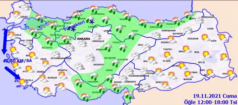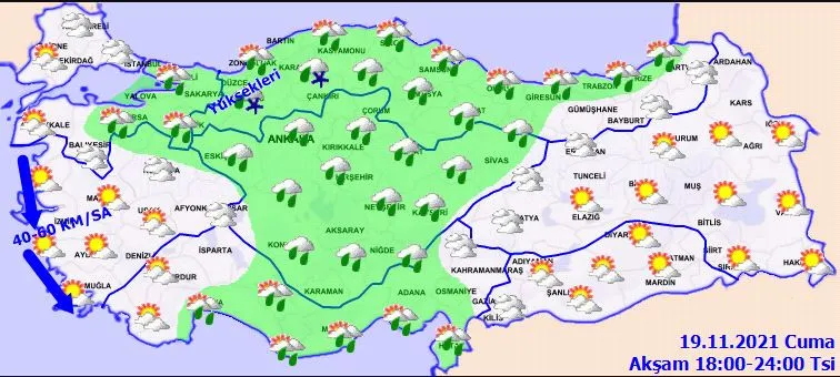 Meteoroloji Genel Müdürlüğü tarafından yapılan son değerlendirmelere göre; Ülkemiz genelinin parçalı ve yer yer çok bulutlu, Marmara’nın doğusu, Batı Akdeniz kıyıları, İç Anadolu, Batı ve Orta Karadeniz, Doğu Karadeniz kıyıları, Güneydoğu Anadolu’nun batısı ile Kütahya, Gümüşhane ve Malatya çevrelerinin yağışlı geçeceği tahmin ediliyor. Yağışların; genellikle yağmur ve sağanak, Batı Karadeniz’in iç kesimlerinin yükseklerinde karla karışık yağmur ve yer yer kar şeklinde olması bekleniyor. Rüzgarın; Kıyı Ege’de kuzey ve kuzeybatı yönlerden kuvvetli (40-60 km/sa) olarak eseceği tahmin ediliyor.
