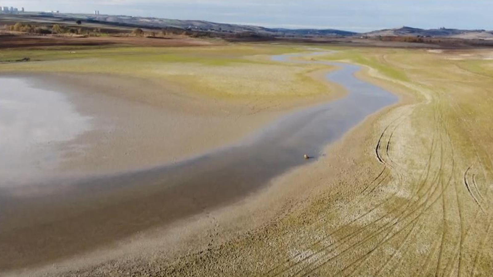 Kuraklıkla karşı karşıya kalan ve adeta dereye dönen baraj, drone ile havadan görüntülendi. Görüntülerde, geçtiğimiz aylarda sular altında olan yerlerin kuruduğu ve aslında baraj olan kısımda hayvanların otladığı görüldü.
