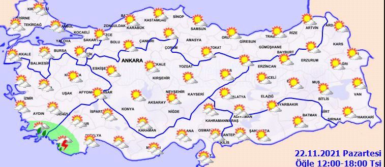 Meteoroloji Genel Müdürlüğü tarafından yapılan son değerlendirmelere göre: Ülkemizin güney ve batı kesimlerinin parçalı ve yer yer çok bulutlu, öğle saatlerinden sonra Muğla çevreleri ile Antalya’nın batı kesimlerinin, gece saatlerinden itibaren Trakya ile Çanakkale çevrelerinin yerel olmak üzere sağanak yağışlı, diğer yerlerin az bulutlu ve açık geçeceği tahmin ediliyor. Sabah ve gece saatlerinde Marmara ile iç ve doğu kesimlerde yer yer pus ve sis bekleniyor.