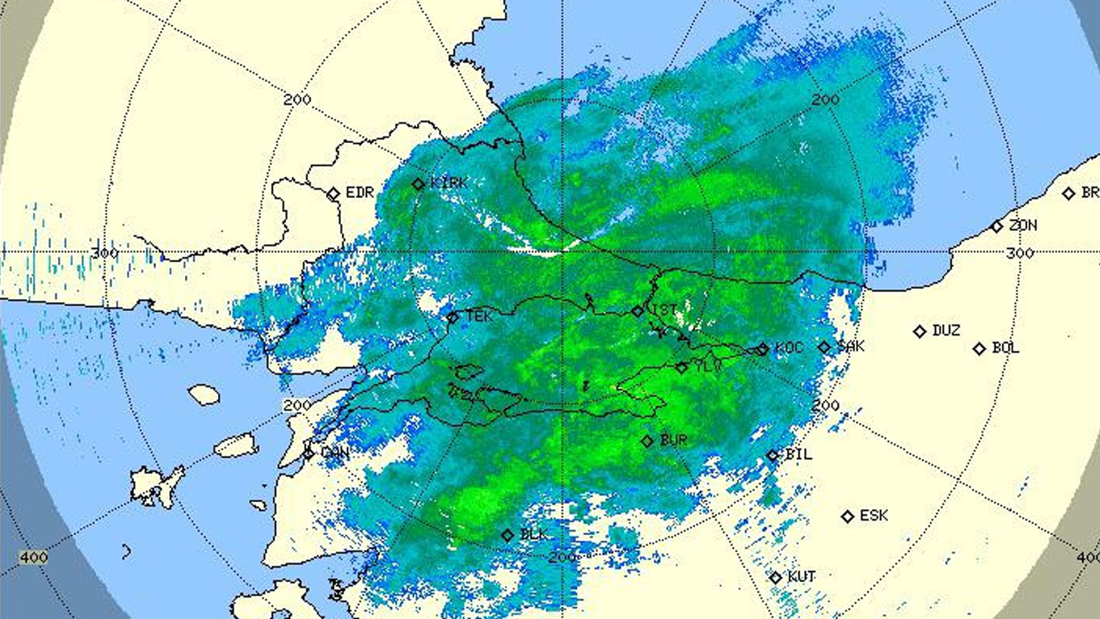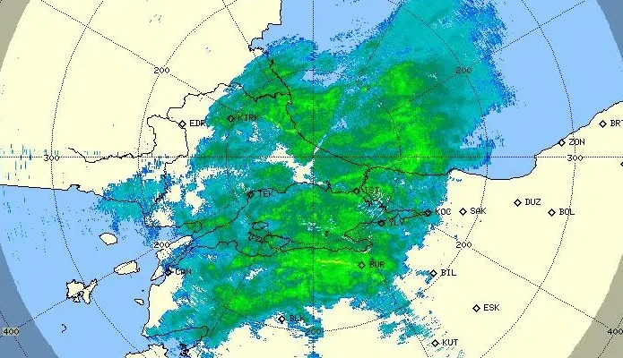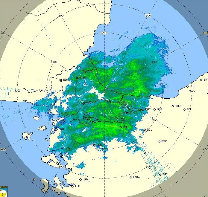 İstanbul ve çevresindeki yağış kütlesi, Meteoroloji Genel Müdürlüğü’nün radarına da böyle yansıdı.