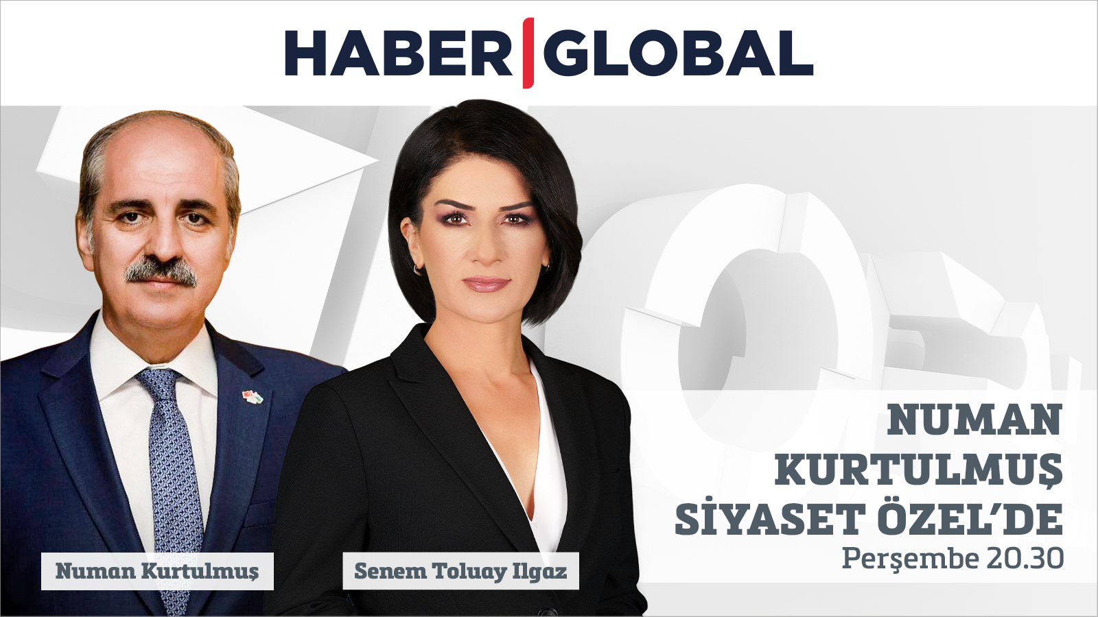 Senem Toluay Ilgaz’ın moderatörlüğünde Gazeteciler Oral Çalışlar, Hacı Yakışıklı ve Haber Global Ankara Temsilcisi Işınsu Tezkan Tüz soracak; AK Parti Genel Başkanvekili ve İstanbul Milletvekili Numan Kurtulmuş “Siyaset Özel”de yanıtlayacak.