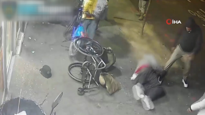 ABD’nin New York eyaletine bağlı Bronx bölgesindeki Mount Hope semtinde tekerlekli sandalyedeki 39 yaşındaki adam, sokak ortasında dehşeti yaşadı. Güvenlik kamerasına yansıyan olayda, 4 kişi tekerlekli sandalyedeki adama saldırdı. Saldırganlardan biri yumrukladığı adamı yere düşürdü. Diğerleri de savunmasız durumdaki adama vurmaya devam etti. New York polisi saldırganların, adamın 800 dolar nakit parasının bulunduğu sırt çantasını ve cep telefonunu çalarak kayıplara karıştığını belirtti.
