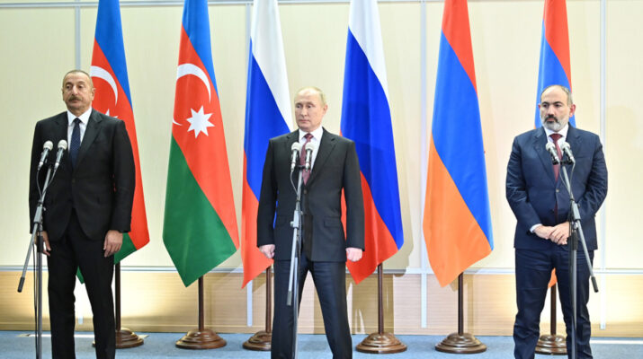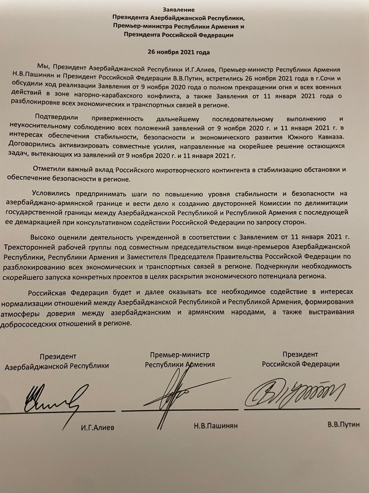 “Biz, Azerbaycan Cumhurbaşkanı İlham Aliyev, Ermenistan Başbakanı Nikol Paşinyan ve Rusya Devlet Başkanı Vladimir Putin, 26 Kasım 2021 tarihinde Soçi’de bir araya geldik ve Karabağ’da tam bir ateşkes sağlanması ve tüm askeri operasyonların durması hakkında 9 Kasım 2020 tarihinde imzalanan bildirinin, bölgedeki tüm ekonomik ve ulaşım hatlarının açılması hakkında 11 Ocak 2021 tarihinde Bildirinin uygulanmasını görüştük.