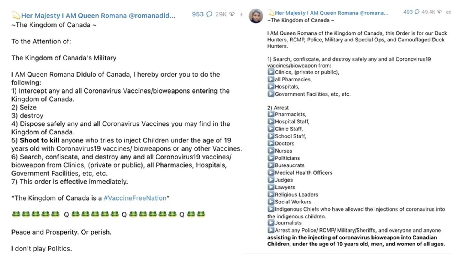 Didulo, Kanadalı bir kadın. Kendisini QAnon Kanada Kraliçesi ilan etmiş durumda. Telegram’da 70 bini aşkın takipçisi var ve bunların bir kısmı azılı takipçiler. Didulo’yu Kanada’nın gizli lideri olarak gören ve kendisinin sözüne koşulsuz uyacak insanlar da mevcut.