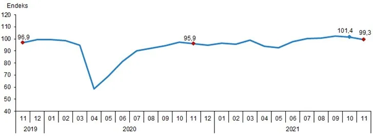 Ekonomik güven endeksi Ekim ayında 101,4 iken, Kasım ayında yüzde 2,0 oranında azalarak 99,3 değerine düştü. Ekonomik güven endeksindeki düşüş, tüketici ve hizmet sektörü güven endekslerindeki düşüşlerden kaynaklandı.