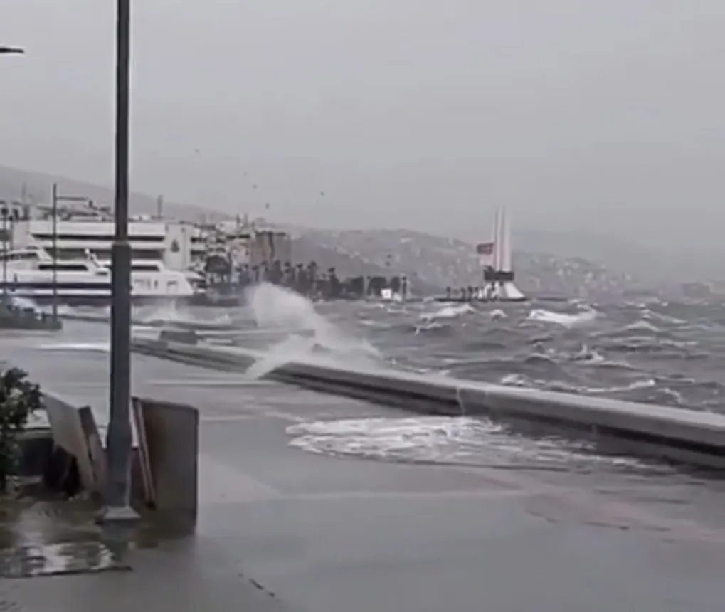 İzmir’de beklenen fırtına sabah saatlerinden itibaren etkisini göstermeye başladı. Saatteki hızı 110 kilometreye kadar çıkan rüzgar nedeniyle arabalı vapur seferleri iptal edilmişti. Yoğun rüzgarların etkisini gösterdiği Karşıyaka sahilinde ise deniz taştı.