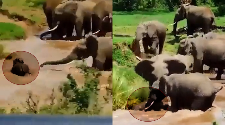 Genç anne fil karşıya geçerken suya kapılan yavrusunu kurtarmak için çırpınırken, başarısız olan anne filin yardımına yetişkin bir fil yetişti. Bebek fili kurtarmak için aşağı inen yetişkin fil, anneyle birlikte bebek fili kurtardı. O anlar kameraya böyle yansıdı.