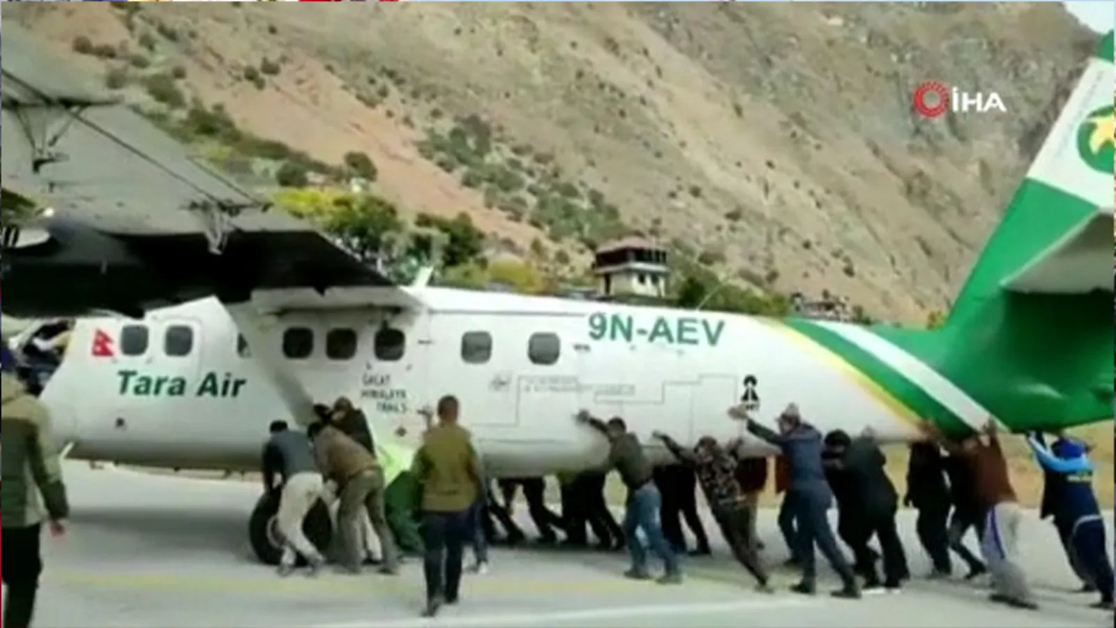 Nepal’in Kolti bölgesinde bulunan Bajura Havaalanında sıra dışı anlar yaşandı. Sosyal medyada hızla yayılarak viral olan görüntülerde, Tara Air’e ait lastiği patlayan bir uçağın, yolcular tarafından itilerek pist dışına çıkarılmaya çalışıldığı görüldü.
