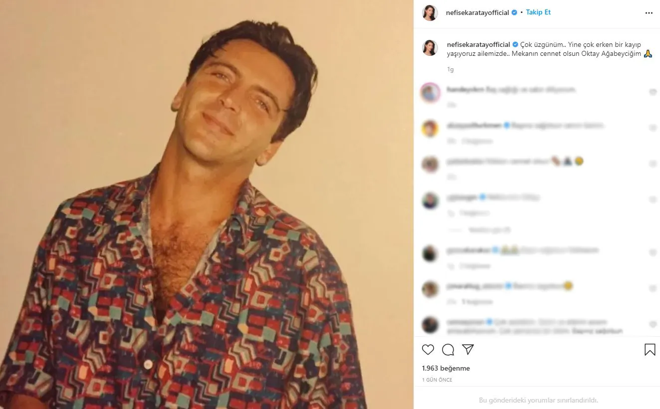 Acı haberi Instagram hesabından duyuran Karatay, “Çok üzgünüm.. Yine çok erken bir kayıp yaşıyoruz ailemizde. Mekanın cennet olsun Oktay ağabeyciğim…” ifadelerini kullandı.