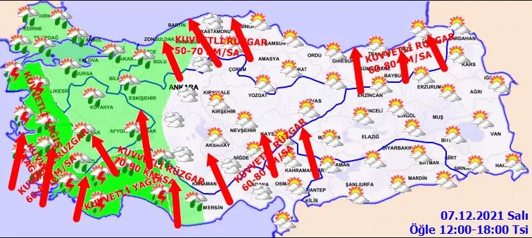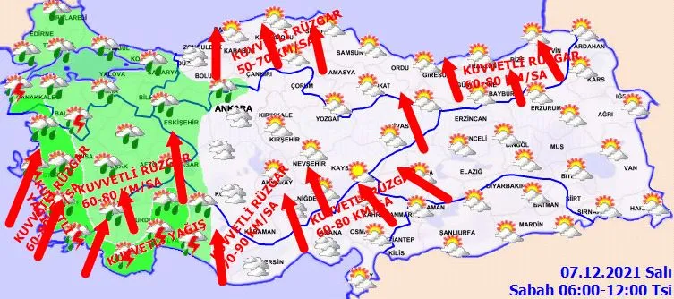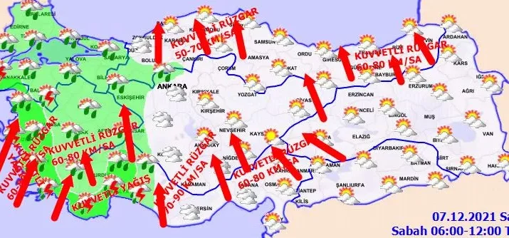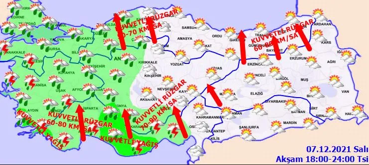 Meteoroloji Genel Müdürlüğü tarafından yapılan son değerlendirmelere göre: Ülkemiz genelinin parçalı ve çok bulutlu, Marmara, Ege, Akdeniz (Kahramanmaraş dışında), İç Anadolu (Sivas dışında) ile Batı Karadeniz’in (Sinop dışında) yağmur ve sağanak, Marmara’nın batısı, Kıyı Ege ile Akdeniz kıyılarının yer yer gök gürültülü sağanak yağışlı geçeceği tahmin ediliyor. Yağışların; Kıyı Ege, Batı Akdeniz, Manisa, Balıkesir ve Çanakkale çevreleri ile Konya’nın güneybatı kesimlerinde kuvvetli, Muğla, Antalya çevreleri, İzmir ve Aydın’ın kıyı ilçeleri, Balıkesir’in batı kıyıları ile Isparta’nın güney, Burdur’un doğu kesimlerinde yer yer çok kuvvetli ve şiddetli olması bekleniyor. Rüzgarın; Güney Ege, Akdeniz, İç Anadolu’nun güney ve doğusu, Karadeniz’in iç kesimleri ile Doğu Anadolu’nun batısında güney yönlerden kuvvetli ve fırtına (50-90 km/sa) şeklinde eseceği tahmin ediliyor.