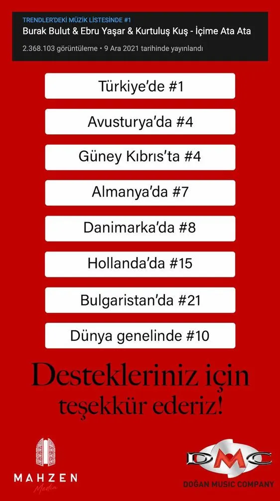 “İçime Ata Ata”nın video klibi dijital platformlarda rekor kırdı. Klip, sadece YouTube’da 24 saatte 3.5 milyonun üzerinde izlendi.