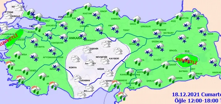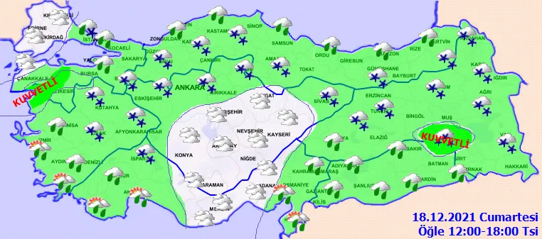 Yağışların; Çanakkale’nin doğusu, Balıkesir’in kuzey ve batısı, Bursa’nın güneyi, Konya’nın güney ve batısı, Burdur’un güney ve doğusunun yüksekleri, Isparta çevreleri, Antalya çevreleri, Eskişehir, Kütahya, Afyonkarahisar, Denizli’nin yüksekleri ile Muğla’nın Yüksekleri, Antalya, Adıyaman, Diyarbakır, Batman, Bingöl, Muş, Bitlis ve Siirt çevrelerinde yerel olarak kuvvetli yağmur ve sağanak, yüksek kesimlerde kuvvetli karla karışık yağmur ve yer yer yoğun kar şeklinde olması bekleniyor.