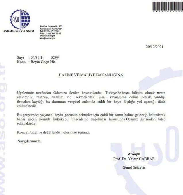 Ajans Bizim’in haberine göre ASO Genel Sekreteri Prof. Dr. Yavuz Cabbar imzasıyla 20 Aralık 2021 tarihinde Hazine ve Maliye Bakanlığı’na gönderilen yazı, “Beyin Göçü hakkında” başlığını taşıyor.
