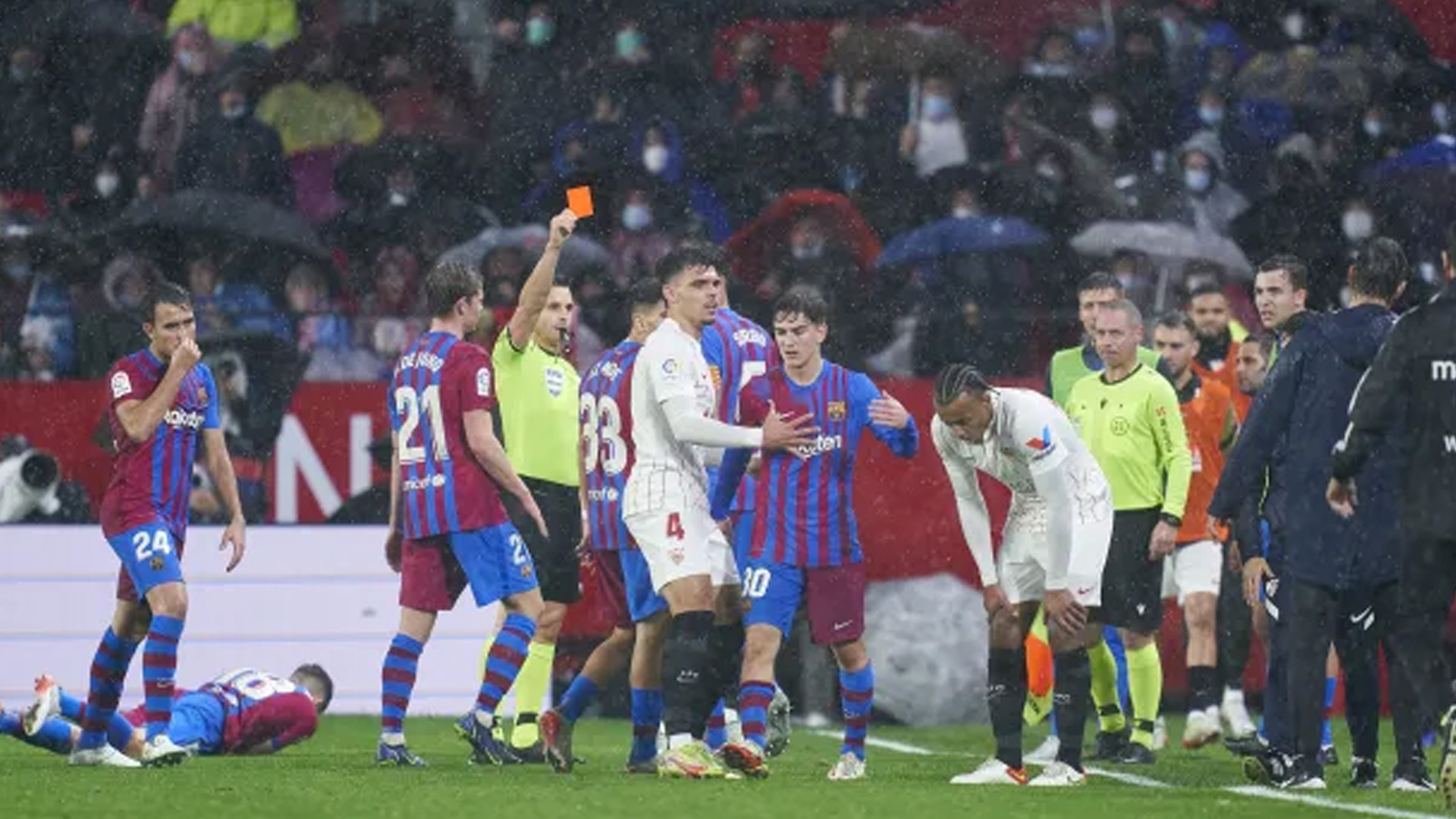 La Liga’da geçtiğimiz gece oynanan Sevilla-Barcelona maçı 1-1’lik beraberlikle sona ererken, Fransız savunmacı Jules Kounde rakibinin suratına top fırlatınca kırmızı kartla oyun dışında kaldı.