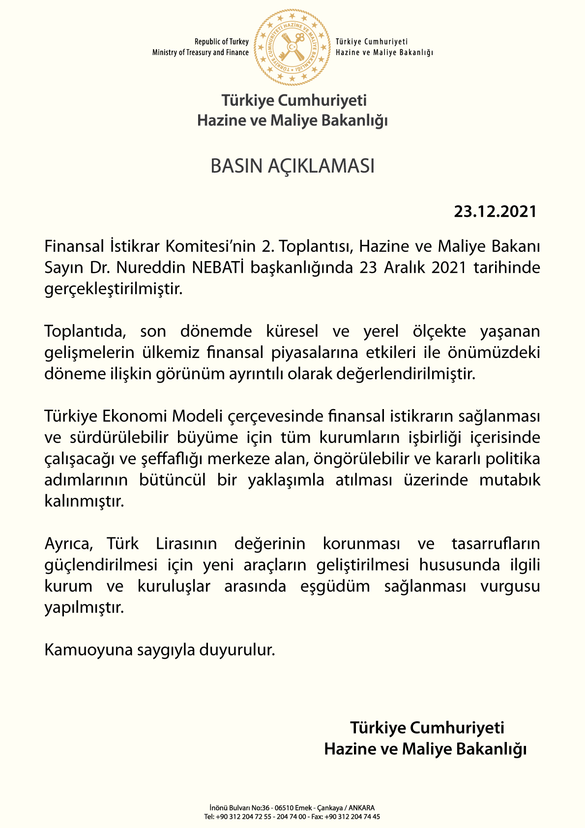 Bugün ikinci kez toplanan Finansal İstikrar Komitesi sonrasında yayınlanan açıklamada “Türk Lirasının değerinin korunması ve tasarrufların güçlendirilmesi için yeni araçların geliştirilmesi hususunda ilgili kurum ve kuruluşlar arasında eşgüdüm sağlanması vurgusu yapılmıştır.” denildi.