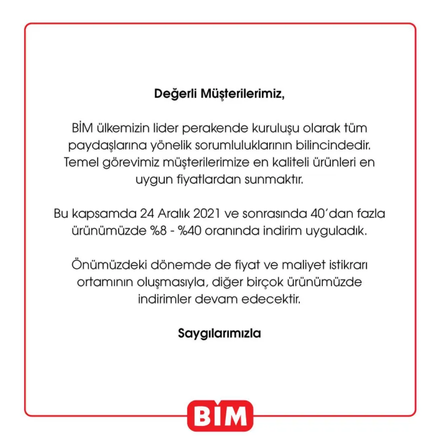 Birleşik Mağazalar AŞ (BİM) sitesinden yaptığı duyuruda 24 Aralık 2021 ve sonrasında 40’tan fazla üründe yüzde 8 ila yüzde 40 arasında değişen oranlarda indirim uygulandığı belirtildi.