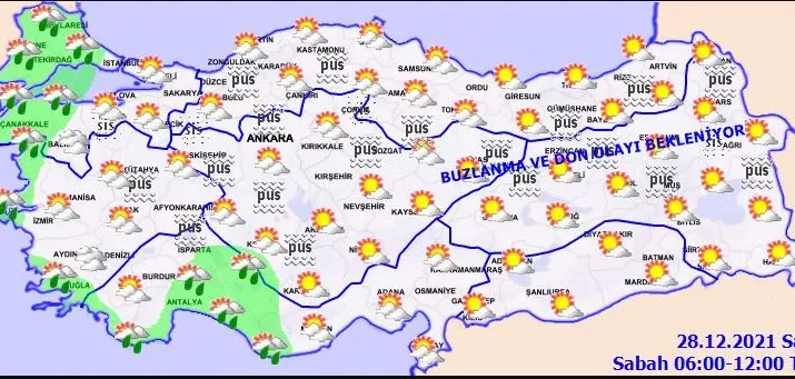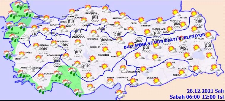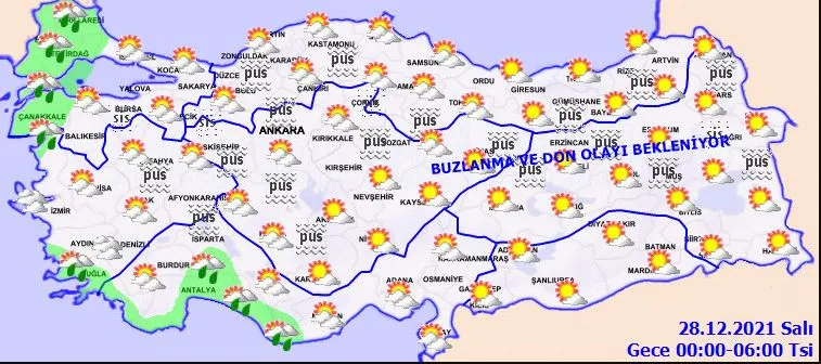 Meteoroloji Genel Müdürlüğü tarafından yapılan son değerlendirmelere göre; Ülkemizin batı kesimlerinin parçalı ve yer yer çok bulutlu, Kıyı Ege, Trakya Kesimi, İstanbul, Kocaeli, Bursa, Yalova, Çanakkale, Antalya, Isparta ve Karaman çevreleri ile Balıkesir’in kıyı kesimlerinin yağmur ve sağanak yağışlı, diğer yerlerin parçalı ve az bulutlu geçeceği tahmin ediliyor. Yağışların; Edirne ve Kırklareli çevrelerinde yerel olarak kuvvetli olması bekleniyor. İç ve doğu kesimlerde buzlanma ve don olayı ile birlikte yer yer pus ve sis bekleniyor.