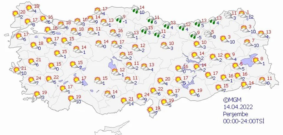 Yurt geneli parçalı, yer yer çok bulutlu, Marmara, Ege, Akdeniz, İç Anadolu, Karadeniz, Doğu Anadolu’nun batısı ile Erzurum, Muş, Kilis, Gaziantep, Adıyaman ve Diyarbakır çevrelerinde yağmur yağışı görülüyor.