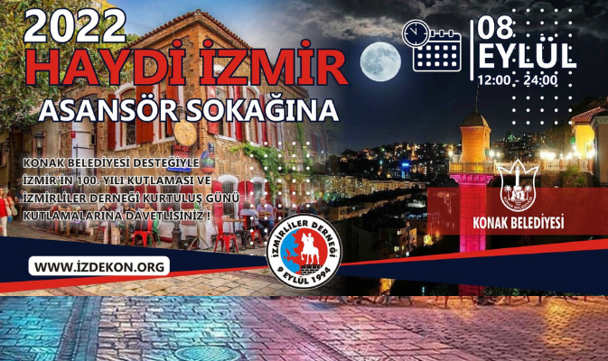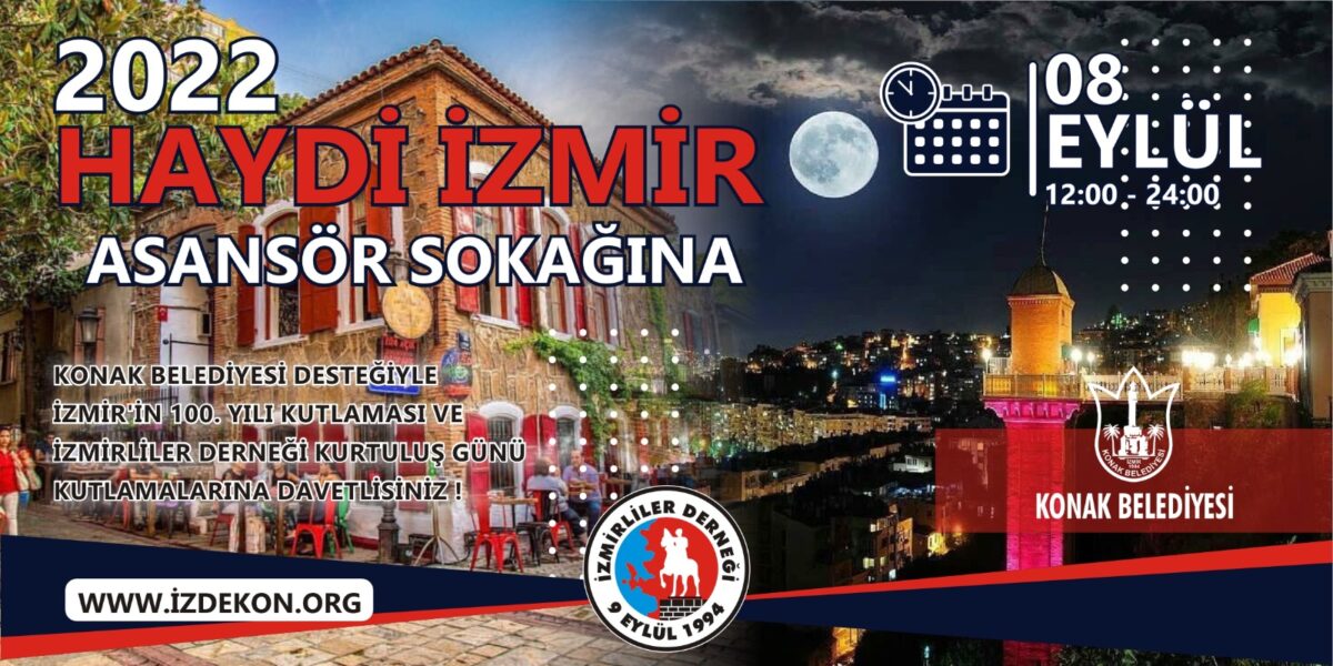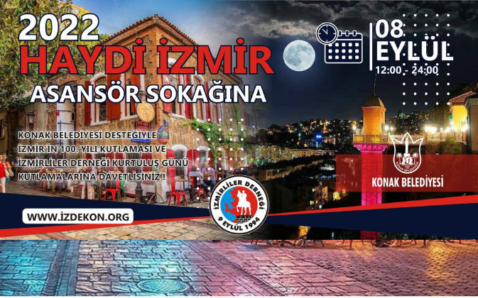 İzmirliler Derneği ile Konak Belediyemiz ortaklığında 9 Eylül İzmir’in Kurtuluşunun 100. Yıl Kutlamaları kapsamında “İzmir Tarihi Asansör Dario Moreno Sokağında” gün boyu sürecek olan kutlamalar ile ilgili program aşağıya çıkarılmıştır. Etkinlikte; gün boyu sokak lezzetleri, kukla gösterileri, kitap imza günü, müzik programları, folklor gösterileri ve müzik performansları sergilenecektir. Etkinlik aynı zamanda Fethiye KAYA’ nın sunuculuğunu yaptığı İzmir Türk TV’den canlı olarak yayınlanacaktır.