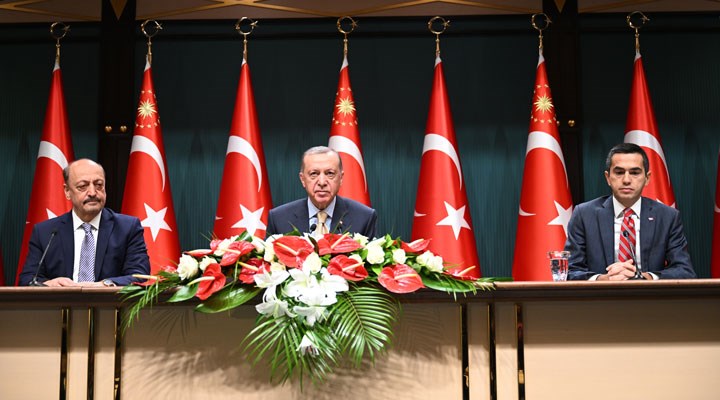 Cumhurbaşkanı Erdoğan’ın, Cumhurbaşkanlığı Külliyesi’nde düzenlediği basın toplantısına Çalışma ve Sosyal Güvenlik Bakanı Vedat Bilgin ile işveren kesimini temsilen Türkiye İşveren Sendikaları Konfederasyonu (TİSK) Başkanı Özgür Burak Akkol da katılırken, asgari ücret tekliflerini 9 bin lira olarak açıklayan Türk-İş Başkanı Ergün Atalay ise yer almadı. Erdoğan, “Yapılan bir dizi toplantı sonunda çalışan ve işveren tarafları maalesef ortak bir rakam üzerinde anlaşamamışlardır. Hükumet olarak biz tüm tarafların tekliflerini ve gerekçelerini saygıyla karşılıyoruz. Elbette her kesim kendi öncelikleri, kendi hassasiyetleri, kendi çıkarları doğrultusunda bir tutum ortaya koyacaktır. Bize düşen görev ülkemiz ve milletimiz için en doğru, en hakkaniyetli, en sürdürülebilir sonucun ortaya çıkmasını sağlamaktır. Ne emekçilerimizin haklarının yenmesine ne de işverenlerimizin üzerine altından kalkamayacakları bir yükün bindirilerek istihdamın zarar görmesine rıza gösteririz” dedi.