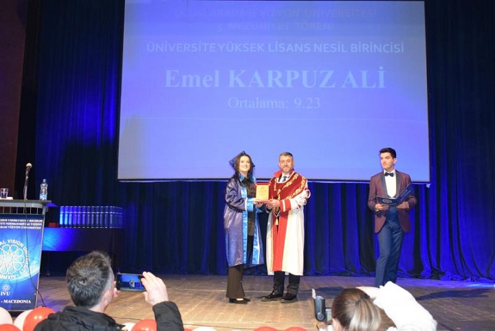 Programın sonunda Uluslararasi Vizyon Üniversitesi Rektörü Prof.Dr Ahmet Vecdi CAN , Kurucu Rektör Prof.Dr Fadıl HOCA, Rektör yardımcıları Prof.Dr Abdülmecit NUREDİN, Prof.Dr Mensur NUREDİN ve Prof.Dr Zoran FİLİPOVSKİ tarafından değerli katılımcılara plaket takdimi yapıldıktan sonra, mezun öğrencilere diplomaları ,nesil ve bölüm birincilerine ise takdirnameler verildi. Kep atma töreniyle programın kapanışı yapıldı.