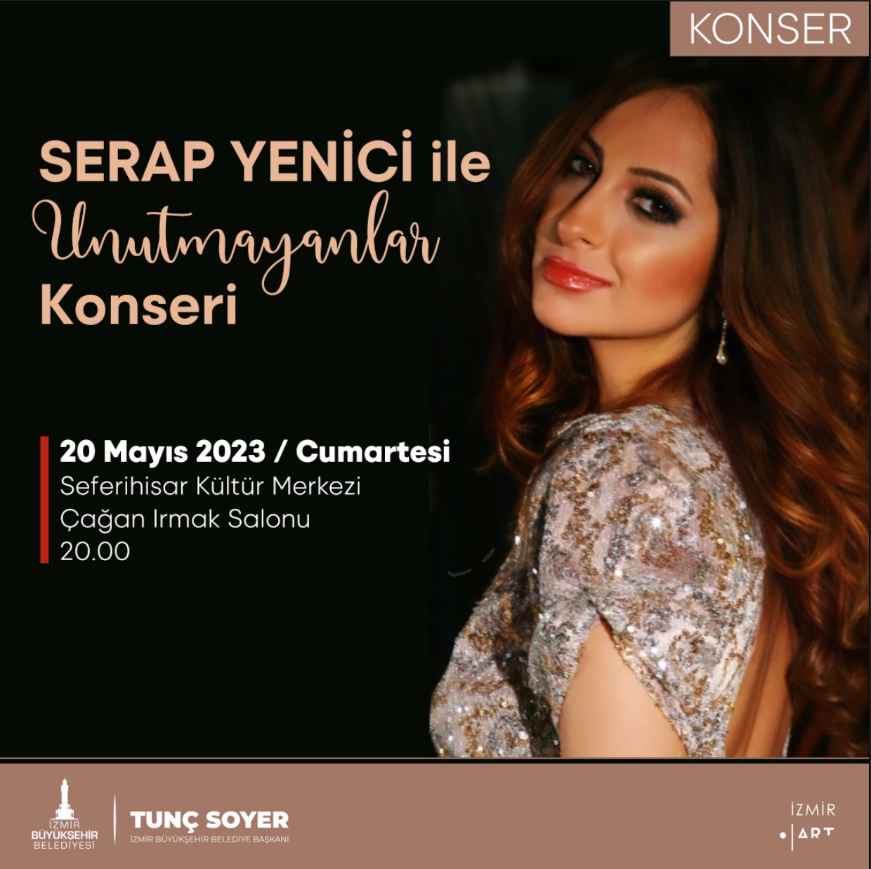 İzmir büyükşehir belediyesi tüm müzikseverleri kaliteli sesi yorumuyla en seçkin eserleriyle Serap Yenici’yi dinlemek üzere Seferihisar kültür merkezi Çağan Irmak salonuna davet ediyor.