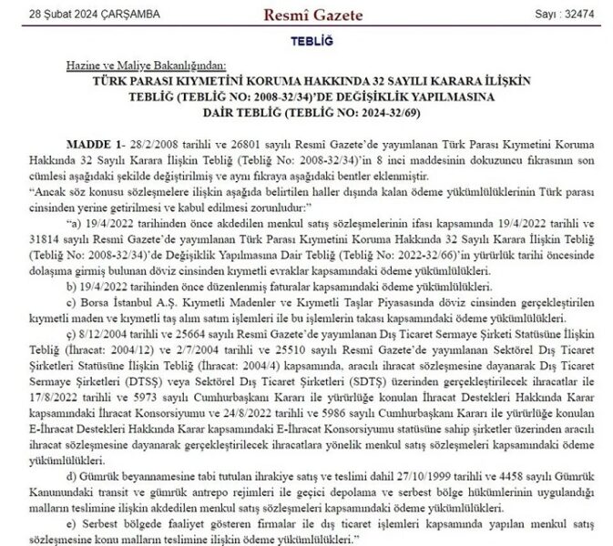 Hazine ve Maliye Bakanlığı, Türk Parası Kıymetini Koruma Hakkında 32 Sayılı Karara İlişkin Tebliğ’de Değişiklik Yapılmasına Dair Tebliğ’i Resmi Gazete’de yayımladı.