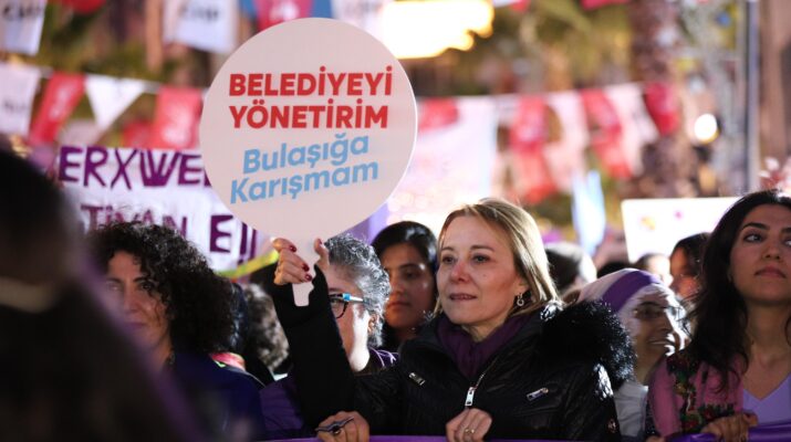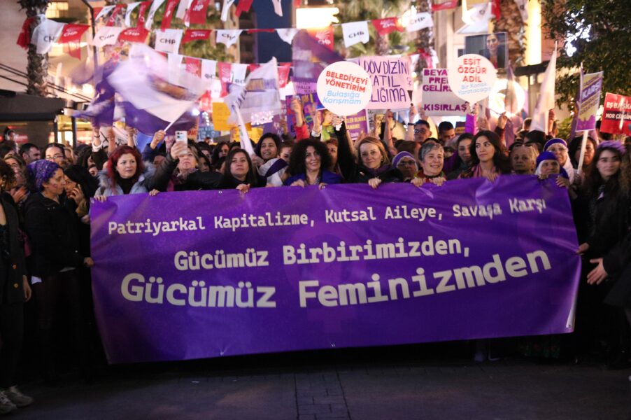Başkan Adayı Mutlu, daha sonra DİSK Genel İş Sendikası İzmir Kadın Komisyonları tarafından Kıbrıs Şehitleri Caddesi boyunca düzenlenen yürüyüşe katıldı. “Şiddete, sömürüye, yoksulluğa karşı sokaklardayız” yazılı pankartın arkasında yürüyen Mutlu, “Yaşasın kadın dayanışması”, “Susmuyoruz korkmuyoruz itaat etmiyoruz” ve “Dünya yerinden oynar kadınlar özgür olsa” sloganlarına eşlik etti.