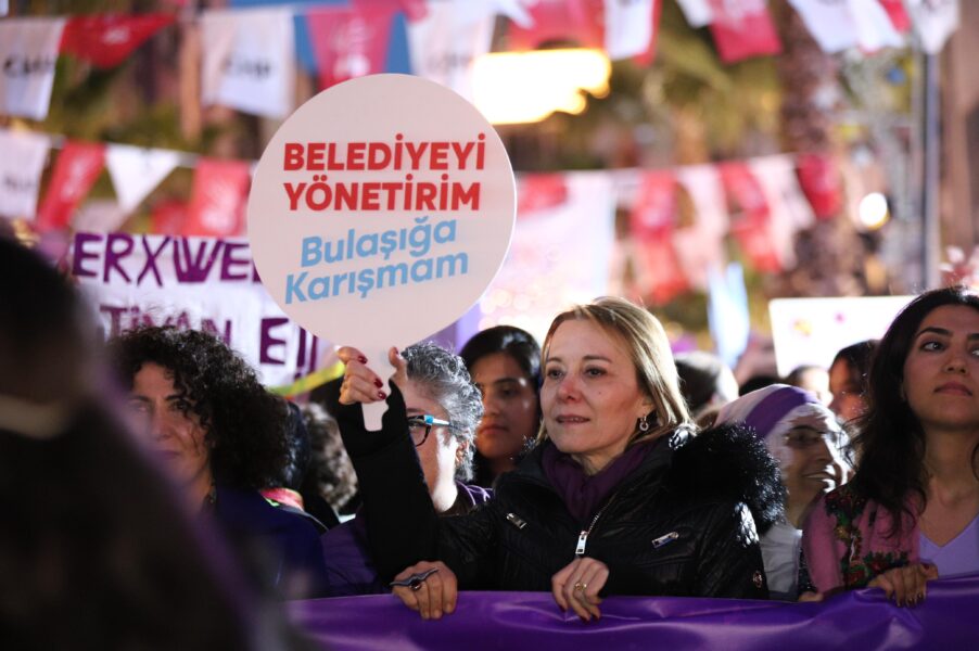 CHP Konak Adayı Nilüfer Çınarlı Mutlu, 8 Mart Dünya Kadınlar Günü’nde evde, işte ve sokakta kadınlarla bir araya geldi. 8 Mart finalini Feminist Gece Yürüyüşü ile yapan Mutlu’nun elinde taşıdığı “Belediyeyi yönetirim bulaşığı karışmam” yazılı döviz büyük beğeni topladı.