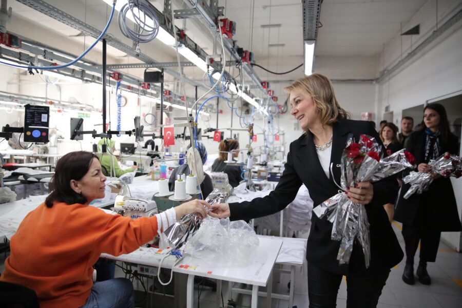 CHP Konak Belediye Başkan Adayı Nilüfer Çınarlı Mutlu, 8 Mart Dünya Kadınlar Günü dolayısıyla tekstil atölyesinde çalışan kadınlarla bir araya geldi. Egedeniz Tekstil’i ziyaret ederek birimleri gezen Mutlu, kadın çalışanlara karanfil dağıttı. Emekçi kadınlarla daima dayanışma içerisinde olacaklarını vurgulayan Mutlu, “Yeni dönemde özel sektör ile iş birliklerini çok önemsiyoruz. Çünkü istihdam sorunu sebebiyle belediyelere binlerce CV geliyor. Yerel yönetimler bu sorunu tek başına çözemez. Yeni iş olanakları yaratmamız gerekiyor. Sizlerin ihtiyacı olan insan gücünü yetiştirmek istiyoruz. Kadınlar için güvenceli iş olanakları yaratılmalı” dedi. Ziyaret sonunda Mutlu’ya Konak Özel Eğitim Meslek Okulu tarafından tamamen geri dönüşüm malzemelerinden yapılan bez çanta ve çeşitli ürünler hediye edildi.