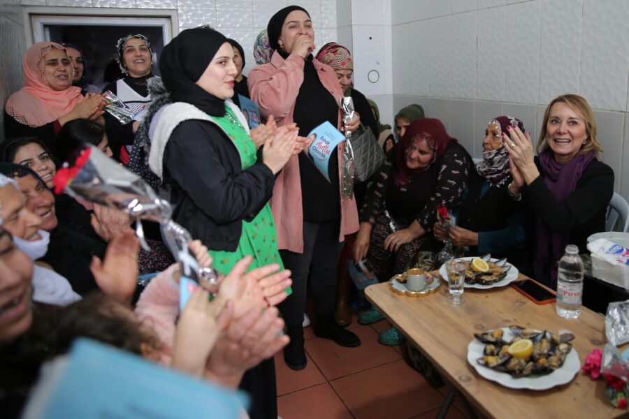 Bir sonraki durağı 1. Kadriye Mahallesi olan Mutlu, midye dolma üretimi yapan Mardinli emekçi kadınlarla bir araya geldi. İmalathanelere ziyaretler gerçekleştiren Mutlu, kendisini zılgıtlarla karşılayan kadınlara karanfil dağıttı ve günlerini kutladı. İkram edilen midye dolmalardan da tadan Mutlu’ya kadınlar, “Gönlümüzün mimarı olacaksınız” sözleriyle destek verdi. Misafirperverlikleri için kadınlara teşekkür eden Mutlu, “Bugün 8 Mart Dünya Kadınlar Günü, bugün bizim günümüz. Konak’ta hep birlikte yan yana omuz omuza yürüyeceğiz. Benim kapım herkese açık. Ben belediyeciliği biliyorum, çok çalışmaya geliyorum. Kadınlar hem evde hem işte çok çalışıyor. Kadınların hakkı ödenmez. Bu dönem sizlerin yükünü azaltmak için kreşler ve bakım evleri açacağız. Gönlünüzde yüreğinizde hangi parti olursa olsun oylarınızı istiyorum” ifadelerini kullandı. Ziyaretin sonunda kadınlarla fotoğraf çekilen Mutlu, coşkulu karşılamadan dolayı kadınlara Kürtçe teşekkür etti.
