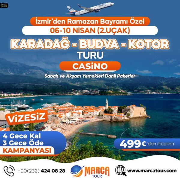 Marca Tour’un Düzenlediği Seyahatler Dolup Taşıyor. Marca Tour Bayramda İzmir’den Vizesiz Budva, Kotor Turu Gerçekleştiriyor. Marca Tour Yoğun İstek üzerine 2.Uçağı 6-10 NİSAN 2024 Tarihlerinde Kaldıracak. Marca Tour’un Bayrama Özel Kampanyasında 4 Gece Kalınıp 3 Gece Fiyatı Ödenecek. Vizesiz gerçekleşecek tur ,Sun Express Hava Yolları ile İzmir-Budva-İzmir direkt uçuş olacak. Misafirler Casino İmkanından Yararlanabilecek.