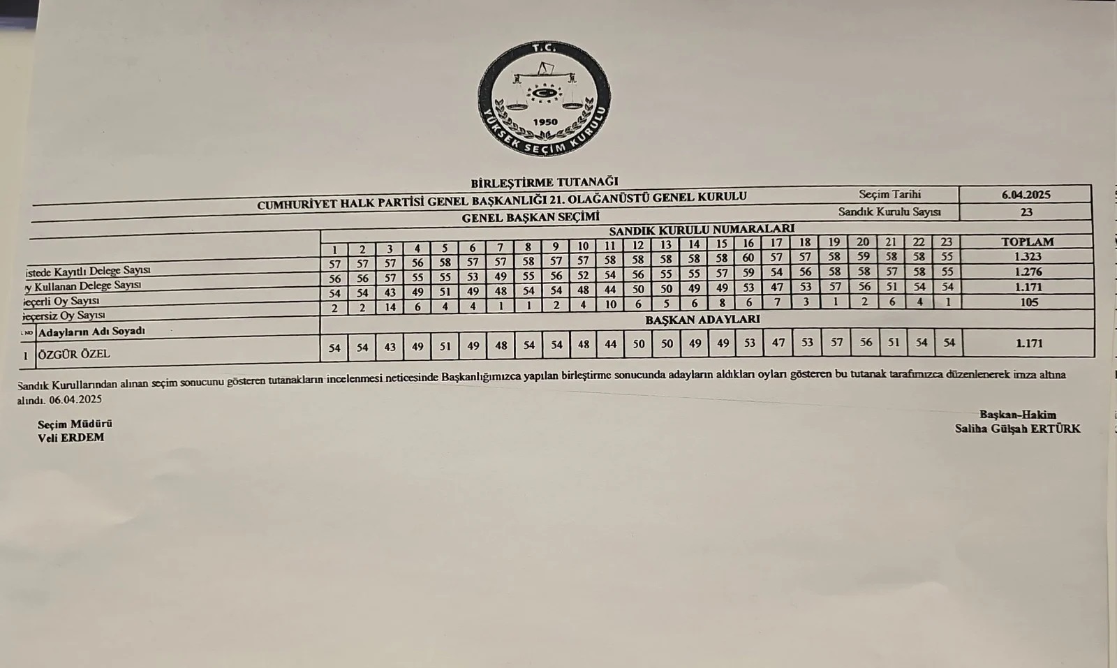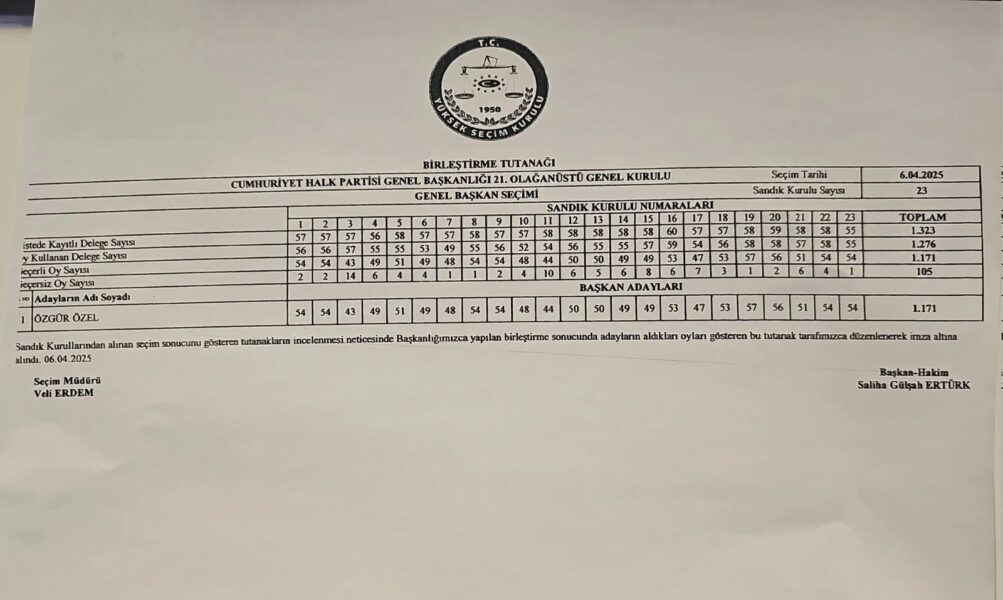 CHP’de Özgür Özel’in yeniden genel başkan olarak seçildiği oylamanın ardından seçim tutanağı ortaya çıktı. 1276 delege oy kullanırken 1171 delegenin oyu geçerli sayıldı. Geçersiz delege sayısı 105 oldu.